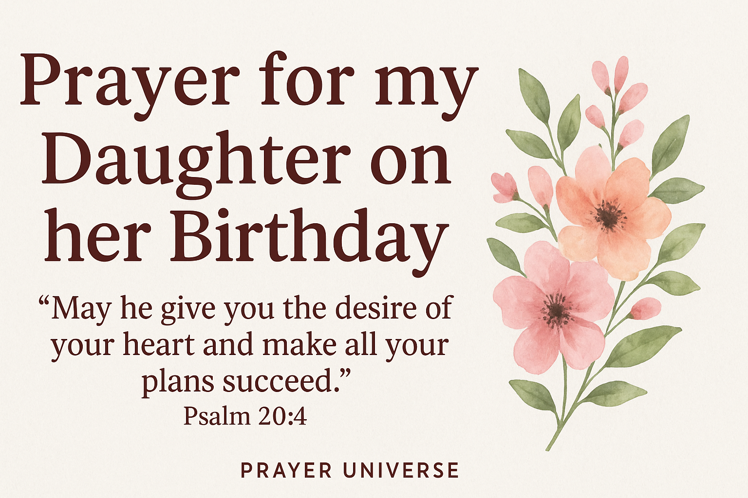 Father, I thank You for my daughter and the gift of her life. Watch over her, strengthen her, and fill her days with love, peace, and happiness. May she flourish in all she does, grow in wisdom, and always know she is cherished. Amen.